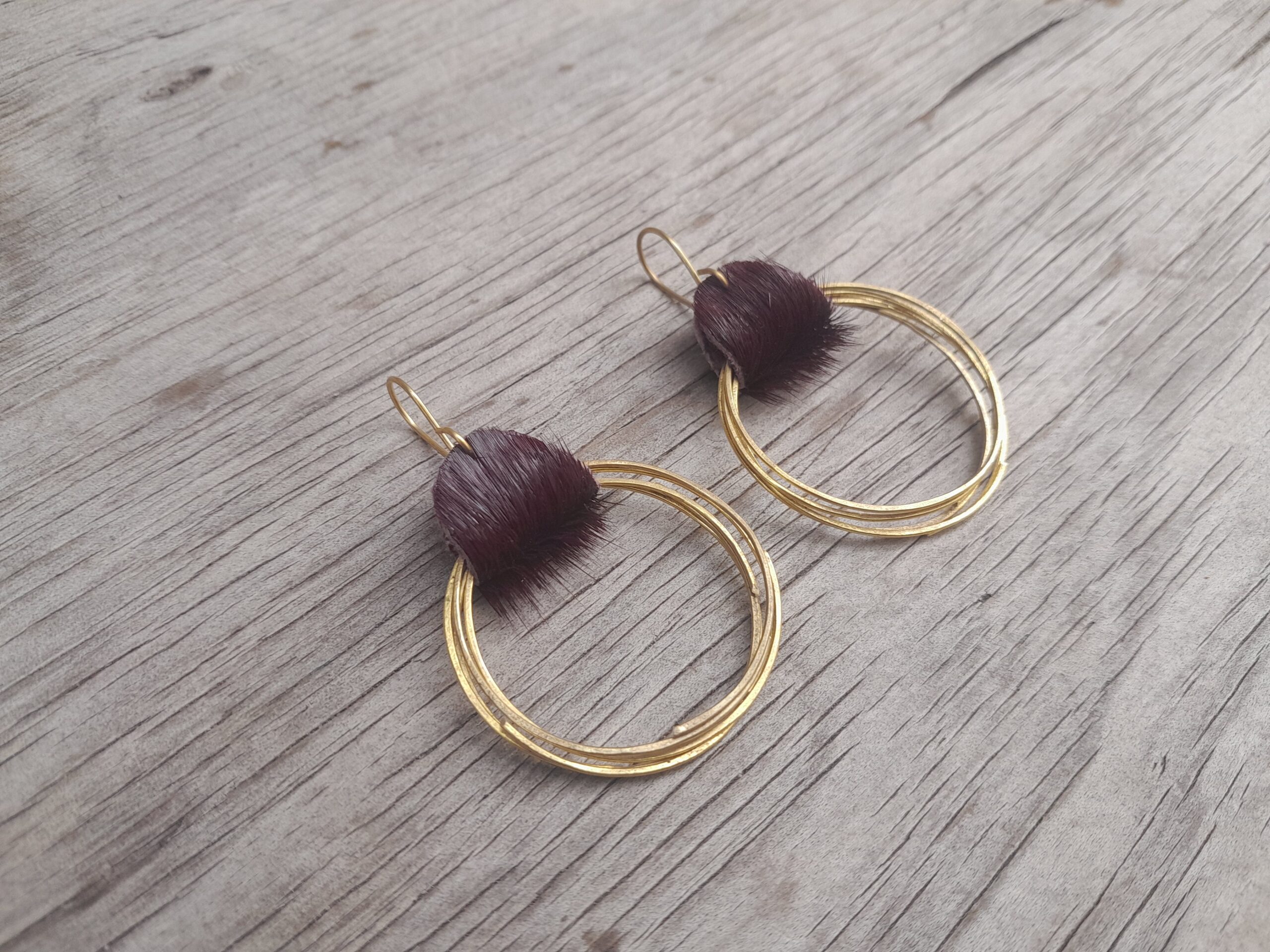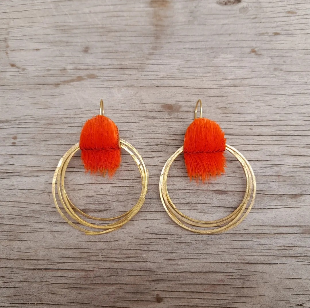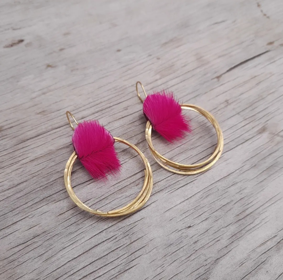 The combination of flat, hammered raw brass in circular shapes with vibrantly dyed Springbok skin creates a striking dangle that balances playfulness and elegance. This versatile accessory can be effortlessly styled for both casual outings and formal events, adding a splash of colour and making a memorable statement.