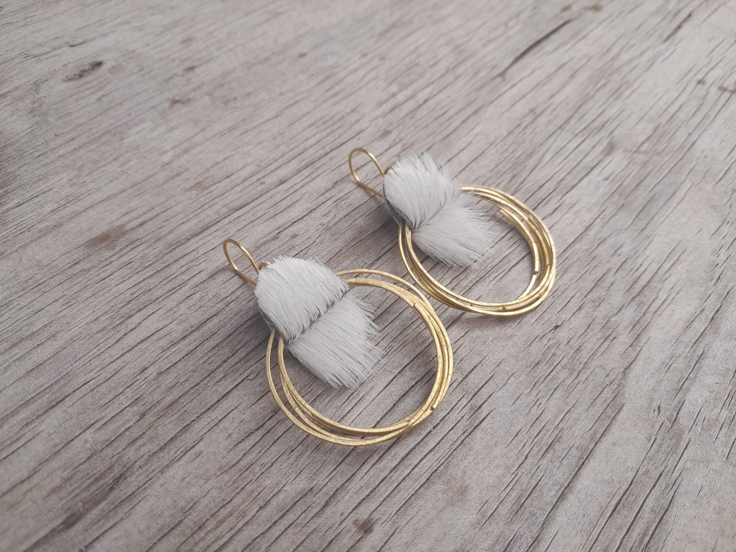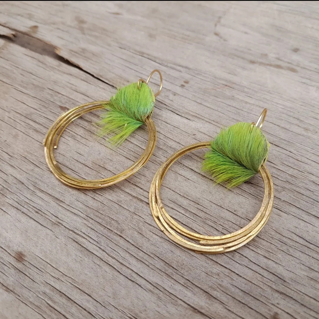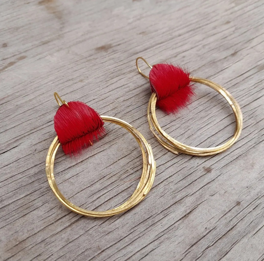 The combination of flat, hammered raw brass in circular shapes with vibrantly dyed Springbok skin creates a striking dangle that balances playfulness and elegance. This versatile accessory can be effortlessly styled for both casual outings and formal events, adding a splash of colour and making a memorable statement.