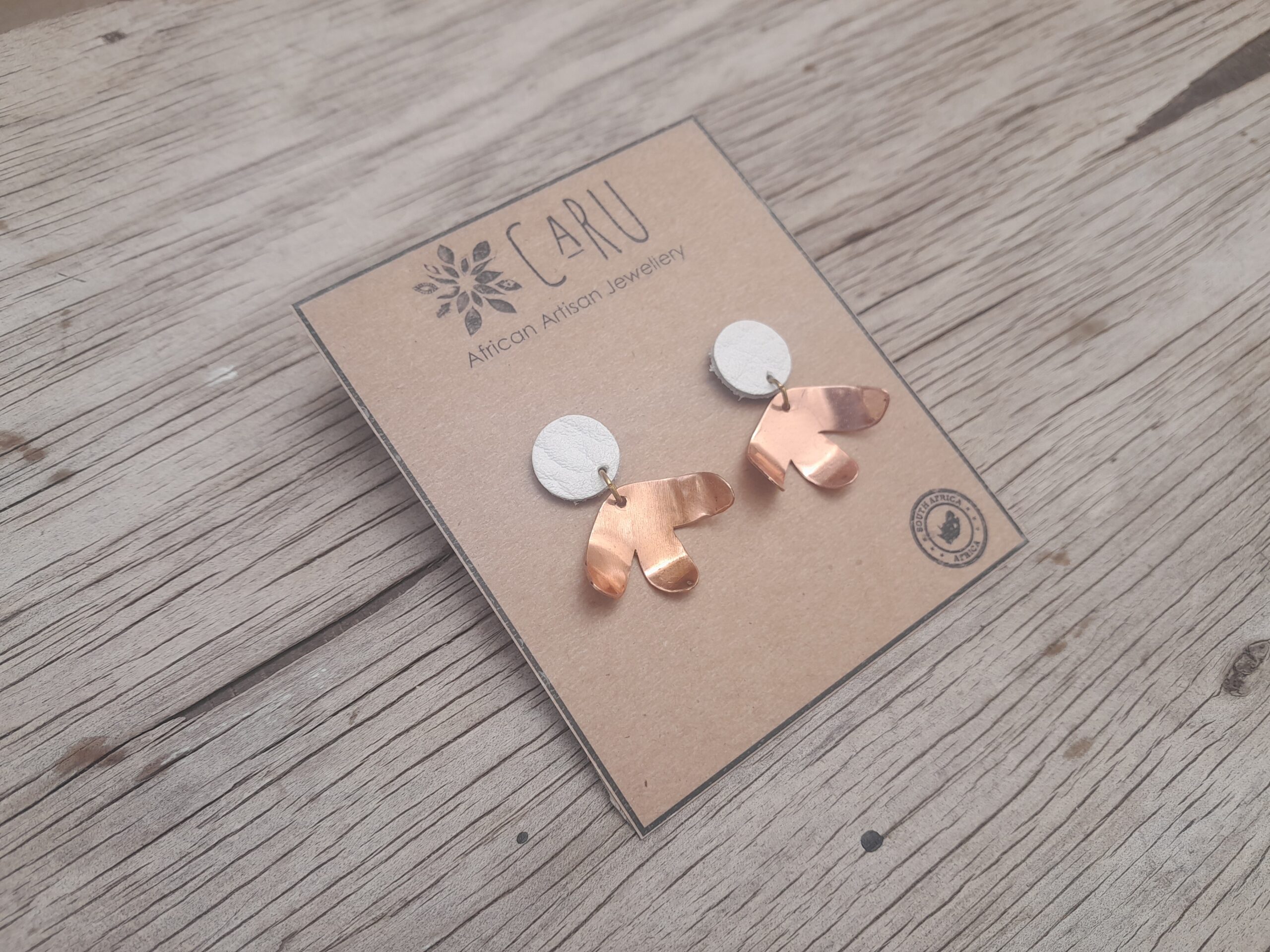 These pretty stud earrings are designed to look great and feel comfortable. The top part is made from soft, hand-cut leather that gives them a unique touch. Below, there is a lovely flower-shaped piece made from copper that dangles down, adding a fun movement when you wear them. The pieces are connected with handmade brass rings, which make them even more special. You can wear these earrings every day or save them for a night out, making them a versatile choice for any occasion.