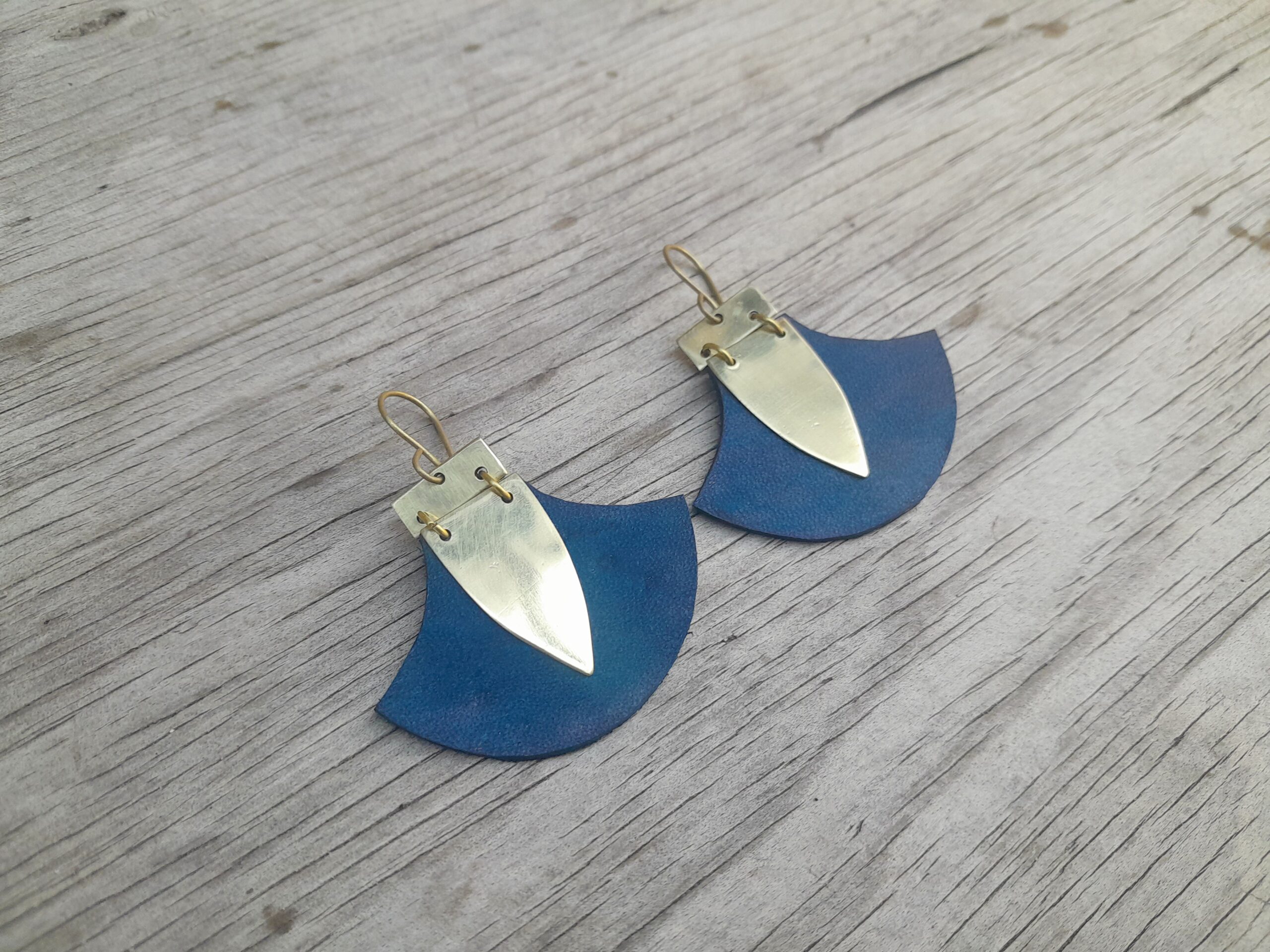 These earrings features a meticulously crafted design, showcasing durable hand-dyed leather paired with hand-cut brass in a striking spear shape. These earrings are designed to make a bold statement, empowering the wearer with a sense of strength and confidence.